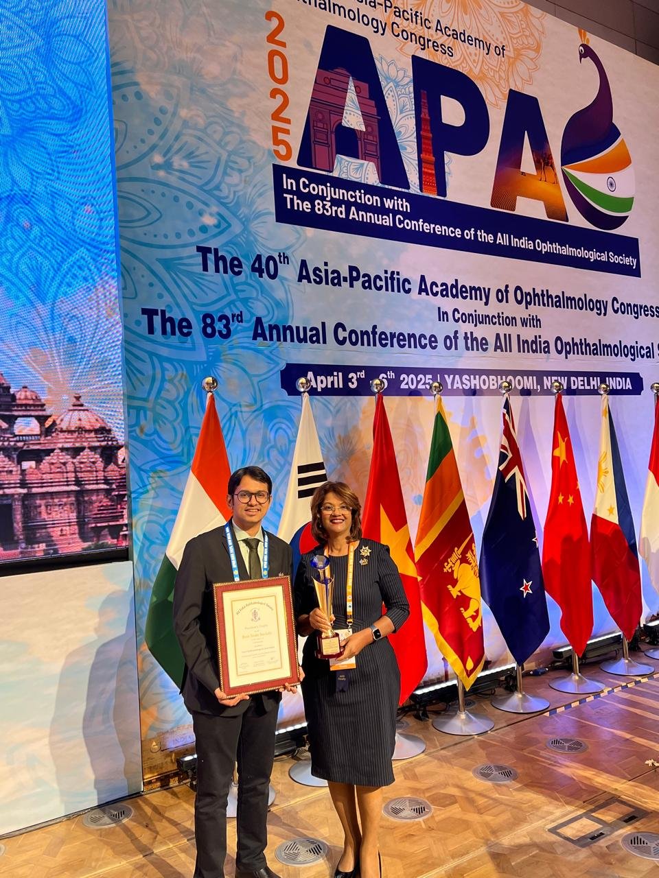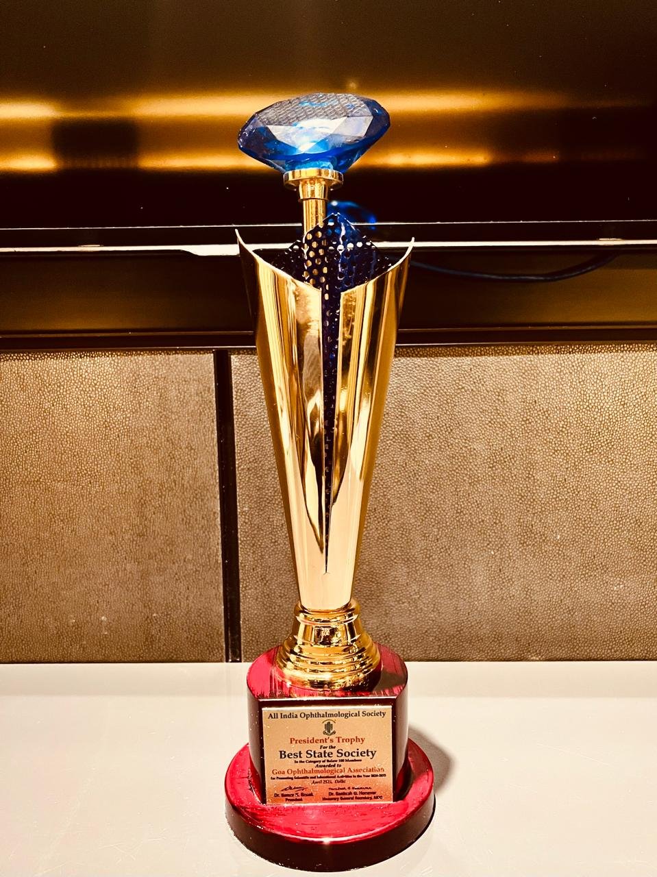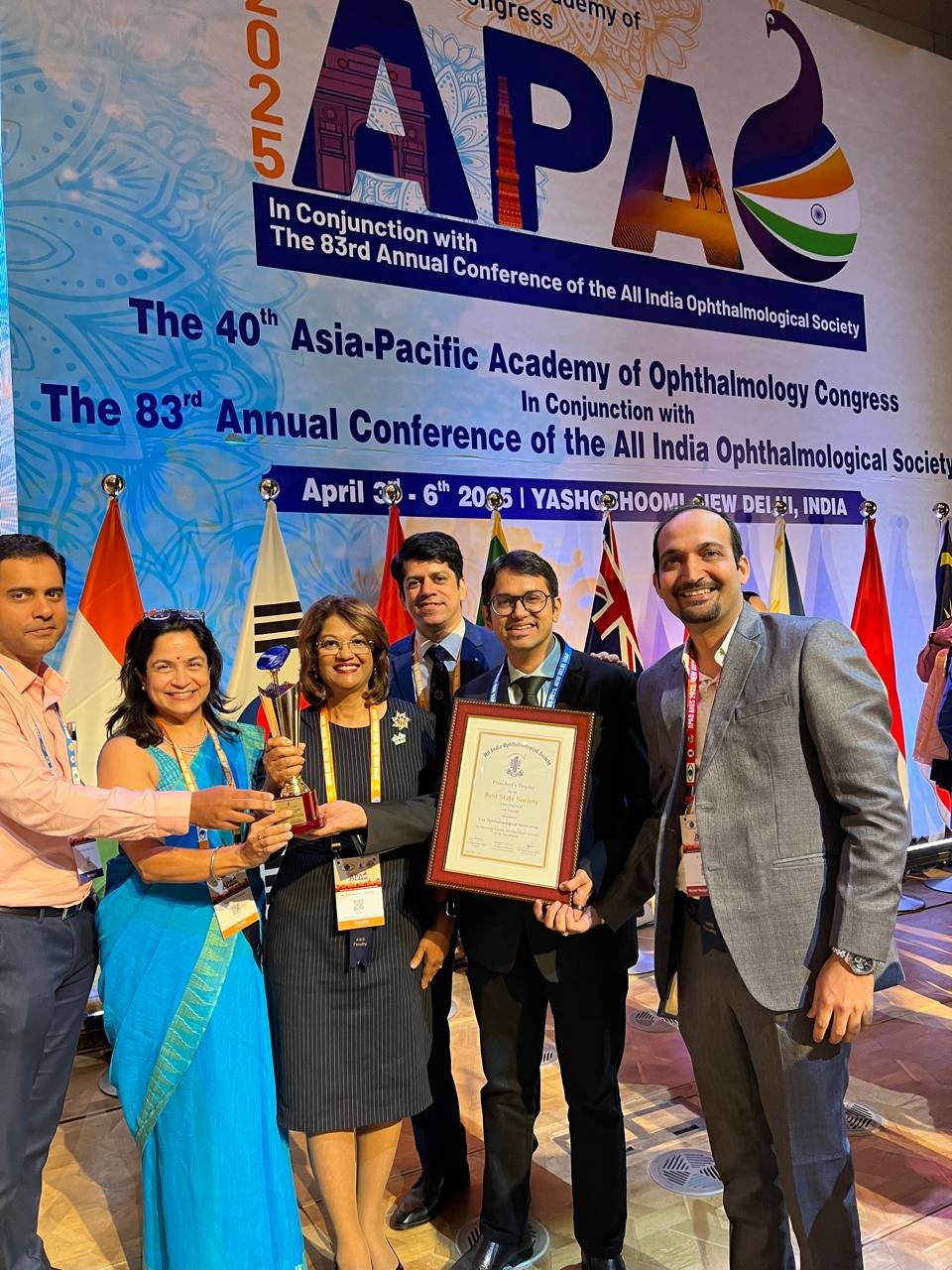 For the second time in a row Goa Ophthalmological Association was awarded with the Best State Society Award by the AIOS in the category of < 100 members for promoting scientific and educational activities in the year 2024-25.The award was received by Dr. Alethea Barbosa (President G.O.A.), Dr. Nikhil Kamat (Secretary G.O.A.) and Dr. Girish Velis (MC Member AIOS) on behalf of the association at the APAO - AIOS conference held in New Delhi in April 2025.